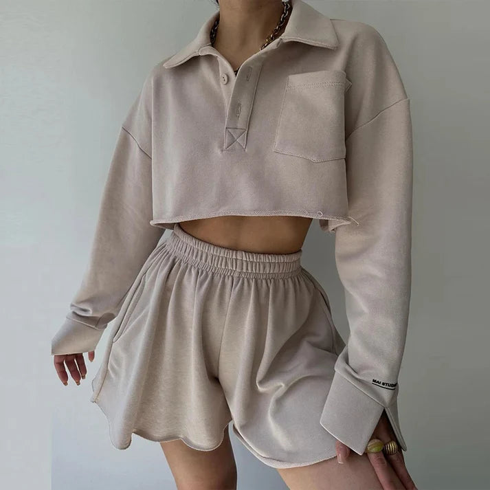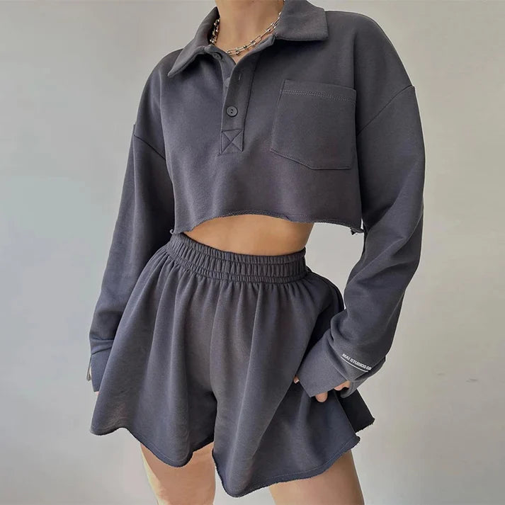 Hier kommt das SultrySoft - Ensemble, in dem Kühnheit auf Unwiderstehlichkeit trifft. Dieses trendige Set aus langärmeligem Oberteil und Shorts wurde entworfen, um die furchtlose Frau in Ihnen zu stärken.