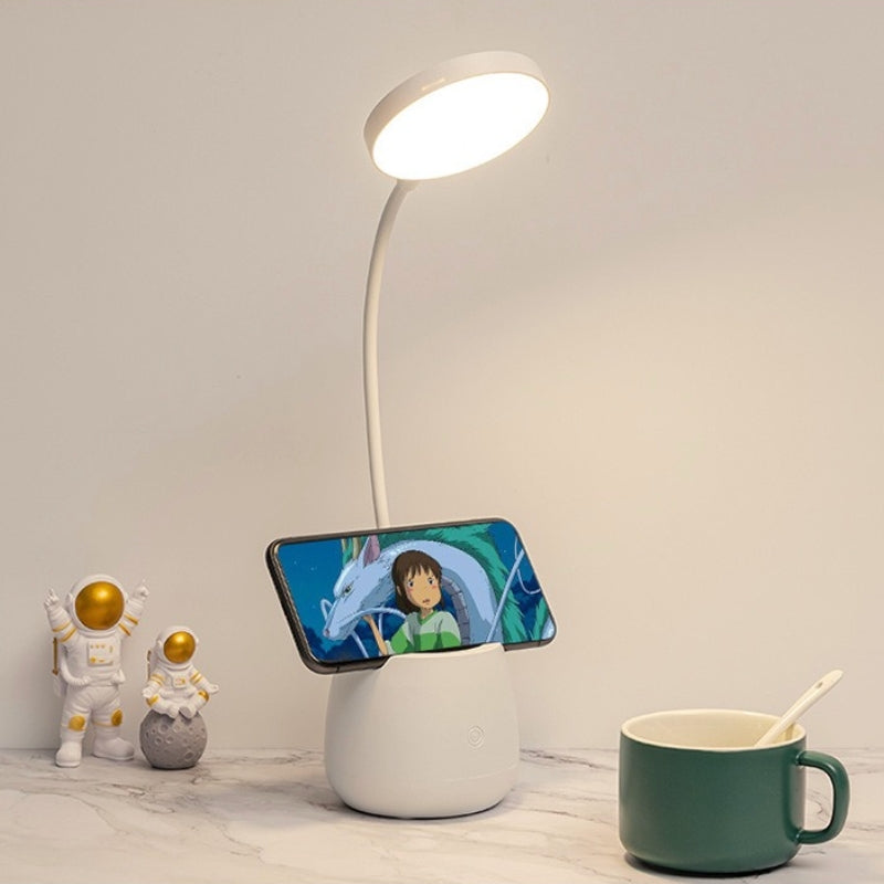 Die LumaHold USB-Tischleuchte besticht durch ihr klares, kompaktes Design mit rundem Sockel, der einen integrierten Stifthalter und eine Handyhalterung enthält. Ihr sanftes, augenfreundliches Licht schafft eine angenehme Atmosphäre zum Lesen, Schreiben oder Zeichnen. Dank Touch-Bedienung lässt sich das Licht ganz einfach ein- und ausschalten und die Helligkeit mit nur einem Fingertipp regulieren. Diese Leuchte vereint Beleuchtung und Schreibtischablage in einem eleganten und funktionalen Element.